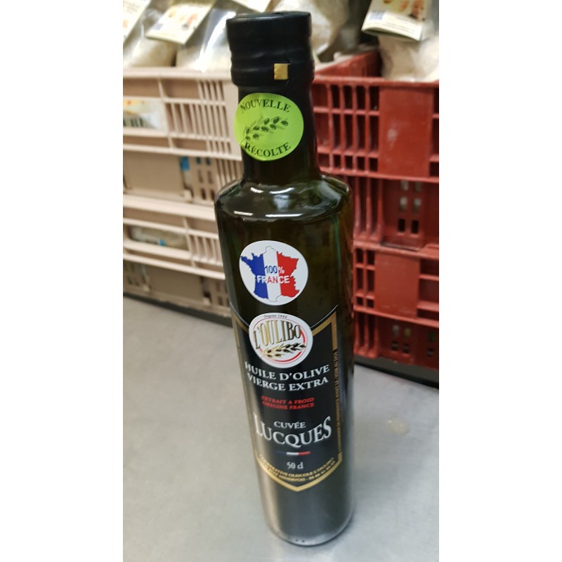 Huile d'olive (Cuvée Lucques) produite dans l'Aude (11120 Bize-Minervois).
