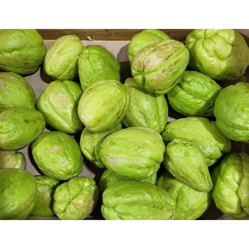 Elle produit des fruits qui ressemblent quelque peu à des poires vertes ou jaunes, à la forme plutôt biscornue et longs d’environ 20 cm. La peau peut être lisse ou épineuse, selon la variété de chayote. Ces grosses baies contiennent un noyau qui est en réalité l’unique graine de ce fruit atypique. La chair de la chayote est de couleur claire et permet de cuisiner des plats au goût exotique. Elle se marie facilement avec la majorité des épices.