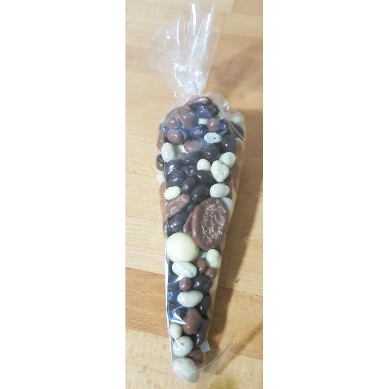 Assortiment de chocolats, présentés dans un sachet en forme de cône.